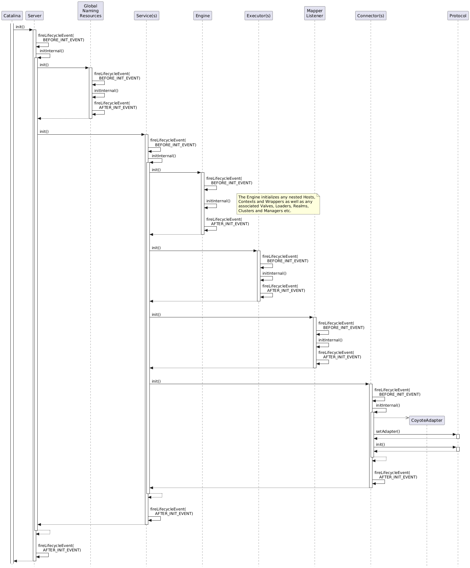 Diagram 2 shows how Tomcat initializes the objects created by the Digester in the previous step and when additional key objects are created. A Server may have several Services although it typically only has one. Each Service may have multiple Connectors. A Connector instance is associated with a single Protocol instance and a single CoyoteAdapter instance.
